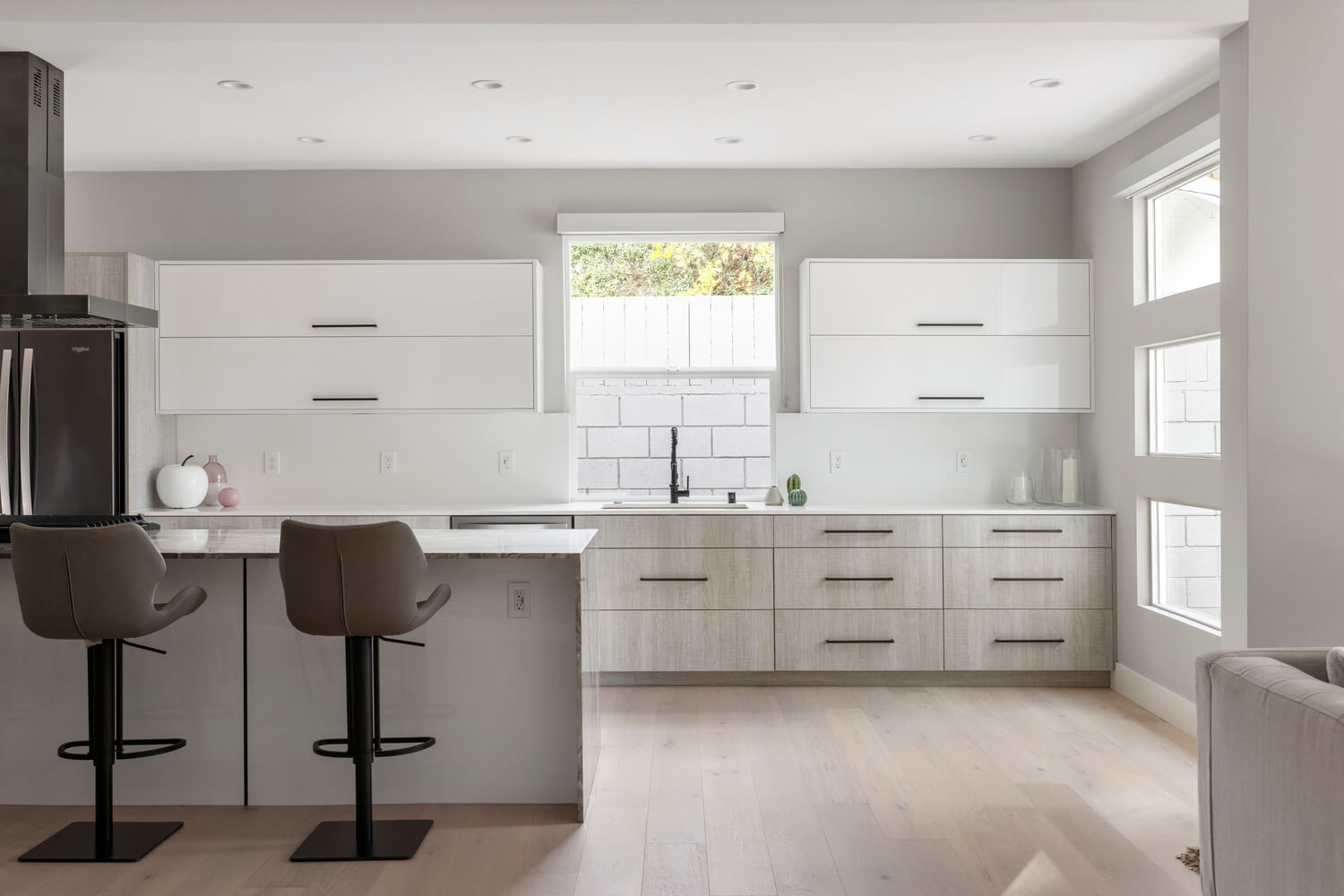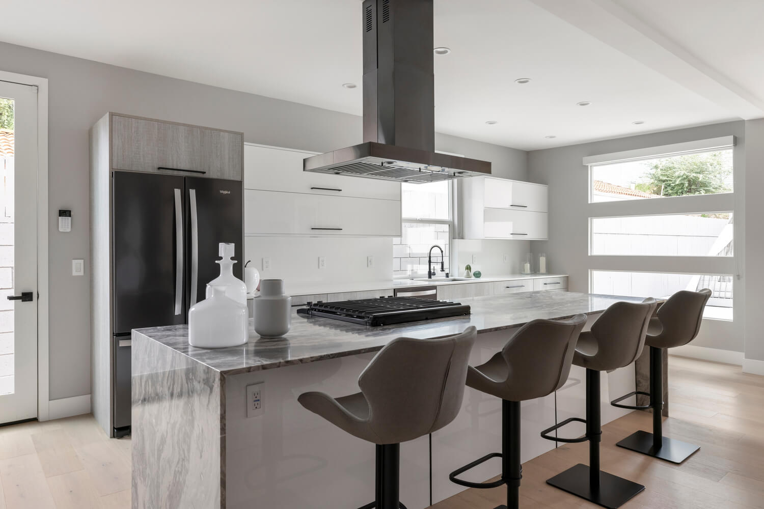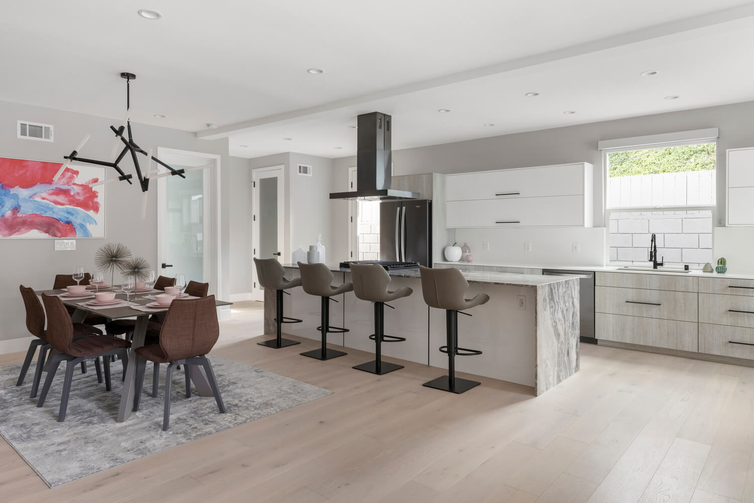 Stunning wide-plank WHITE OAK flooring, recessed lighting, a vast array of windows and custom finishes infuse a dynamic energy into this newly renovated home. The stylish kitchen offers loads of custom soft close cabinetry w/ accent lighting, massive center-island w/ breakfast bar & waterfall edge, quality appliances, exquisite QUARTZ counters & expansive adjacent dining are absolutely spectacular.