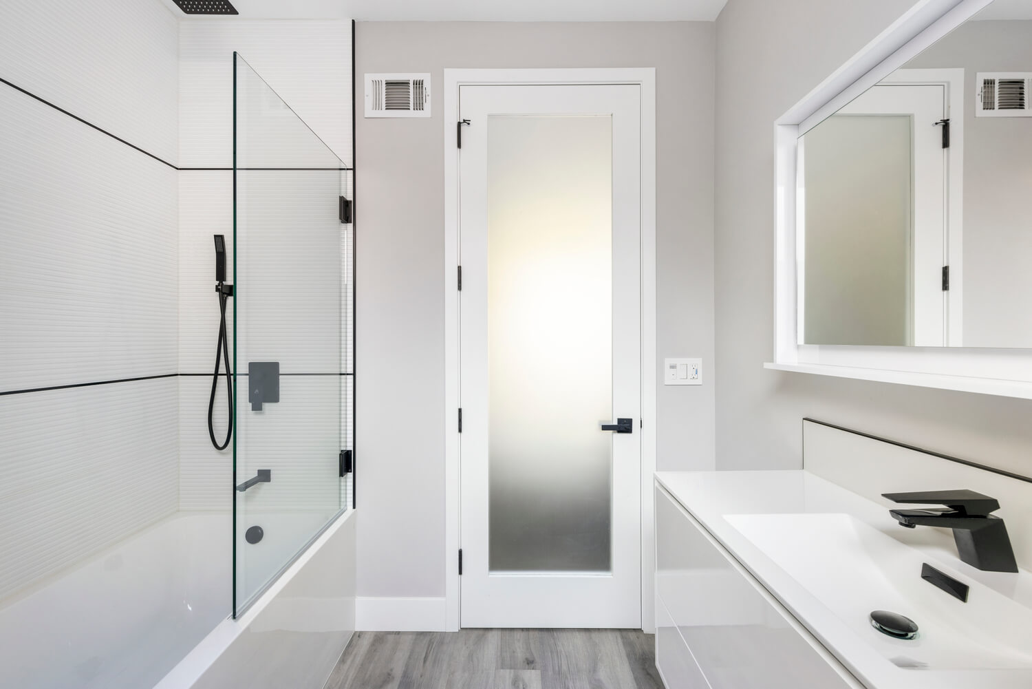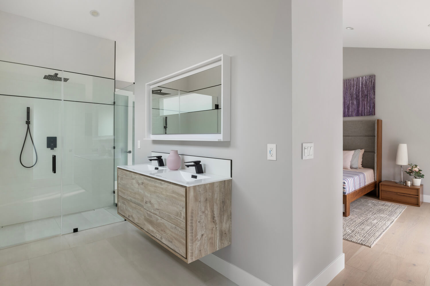 4 spacious bedrooms are located on the first level, one of which features an ensuite bathroom offering a floating vanity and tub/shower combo with frameless glass door, rain shower head & separate body spray. The other 3 bedrooms share a large hall bath, complete with double vanity sinks and curbless walk-in shower. Upstairs, your spacious primary suite dazzles you with soaring vaulted ceilings, loads of recessed LED lighting, dual closets, a private balcony to soak in the rear grounds & a spa-like bathroom you'll never want to leave.